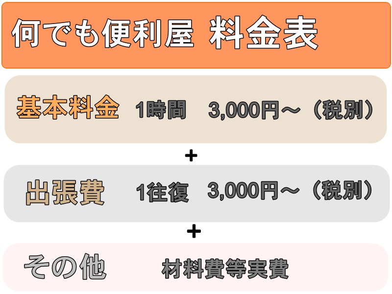 私たちは幅広い便利なサービスを提供しており、様々なニーズにお応えすることができます。 当社の便利屋サービスでは、家庭やオフィスのメンテナンス、修理、改装、清掃、組み立て、引っ越しの手伝いなど、さまざまなタスクを請け負っています。私たちのスキルと経験豊富なスタッフは、高品質な仕事を迅速かつ効率的に行うことができます。 お困りの事項に関しては、まずはお電話またはメールでお知らせください。お客様の要件に基づいて、最適な解決策を提案いたします。作業内容や料金についても、明確で透明性のある説明を行いますので、ご安心ください。 私たちはお客様の満足度を最優先に考えており、信頼と品質に基づいたサービスを提供しています。作業中は丁寧な対応と細やかな気配りを心掛け、お客様のご要望に応えるよう努めます。 便利屋のスケジュールは柔軟で、お客様のご都合に合わせて調整いたします。また、作業前には詳細な見積もりを提供し、料金に納得いただいた上で作業を進めます。 何かお困りのことや質問がありましたら、遠慮なくお知らせください。私たちはお手伝いできることを喜んでお受けいたします。お客様のご要望に応じて最適な解決策を提供し、快適な生活をサポートいたします。